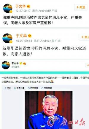 在昨日上午9时17分,于文华删除了这条微博,声明该消息不实,并深表歉意。在新浪微博,于文华摆乌龙一事的关注热度一下窜到了百万人次。