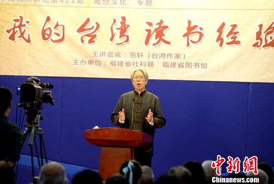中新网福州11月21日电 (王植宁)台湾著名作家亮轩21日,受邀做客由福建省社科联与福建省图书馆共同举办的“东南周末讲坛”,与现场聆听的250余位读者一起分享了他的台湾读书经验。
