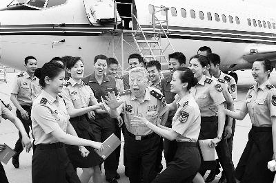 阎肃同志在空军某专机部队采访创作,受到飞行员和专机服务人员的热烈追捧摄/谭超