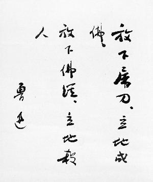 而此次上拍的作品为四句偈语,“放下屠刀,立地成佛;放下佛经,立地杀人”。前两句“放下屠刀,立地成佛”为人所习见,鲁迅笔锋翻转写下“放下佛经,立地杀人”,却很具批判性和讽刺性,带有鲁迅一贯的思想深刻、言辞犀利的特点。