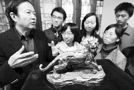 袁熙坤带着被联合国环境规划署选为“地球卫士奖”奖杯的环保动物雕塑《森林守护神(虎)》与《极地之急(北极熊)》的微缩版来到北京大学国学社,为学生们上了一堂生动的环保教育课。