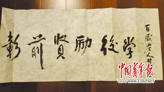 甘惜分在临终前题的最后一幅字——彰前贤励后学。本报记者 何林璘/摄