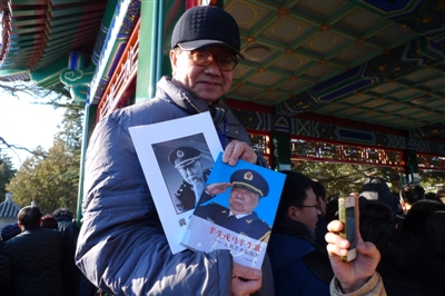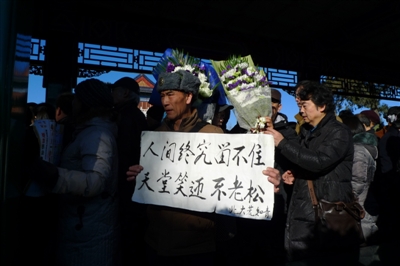 春寒料峭,挡不住人们对老艺术家的追怀。群众中有人高举牌子:“完成阎肃先生遗愿 告慰阎老在天之灵。”这位来自江苏徐州的中年人叫张浩,是一位立志搜集拥军歌曲的徐州市拥军模范,阎老曾勉励过他,他说,自己一清早便从旅馆中出发,来到八宝山排队为阎老送行。