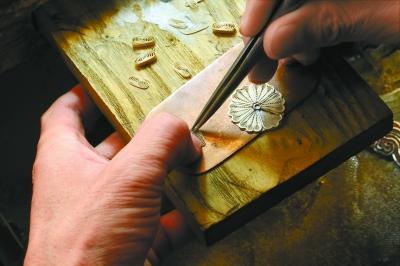 集齐各个部件后,再层层相压,环环相扣,经过巧手编织,撒焊药焊连成器。最后,在花丝间嵌入打磨亮滑的玉石、宝石、珍珠,使其散射出夺目光彩,这就是“金丝镶嵌”。这门出自宫廷的非遗“绝活”,因其用料贵重,历史悠久,属“燕京八绝”之一。而上述步骤,只是其繁复工艺中的一瞥。