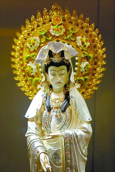 程淑美复制的明万历金丝翼善冠。这件文物出土于上世纪50年代,是金丝镶嵌技艺的巅峰之作。程淑美的技艺比古时更精进。右图为其设计制作的普渡观音。