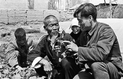 陈忠实(右一)在西安灞桥区莫灵庙大队了解蔬菜生产情况的资料照片。新华社发
