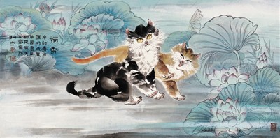 ▲欣赏郭利杰先生的画,总让人有一种温馨喜悦的心情。尤其是他笔下被拟人化了的公鸡和小猫,雄强帅气、甜美细腻,比生活中的动物更可爱更有情趣。郭先生的作品笔墨灵活,浑厚中总能展现出一份俏丽。这恰恰体现了他对笔墨极高的驾驭能力,他以清新的画风巧妙地营造了一个平和的艺术世界。