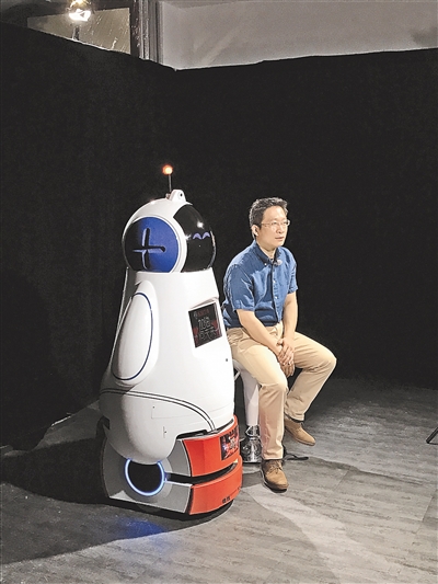 王金桥和脸识别机器人“小加”准备上节目。 资料图片