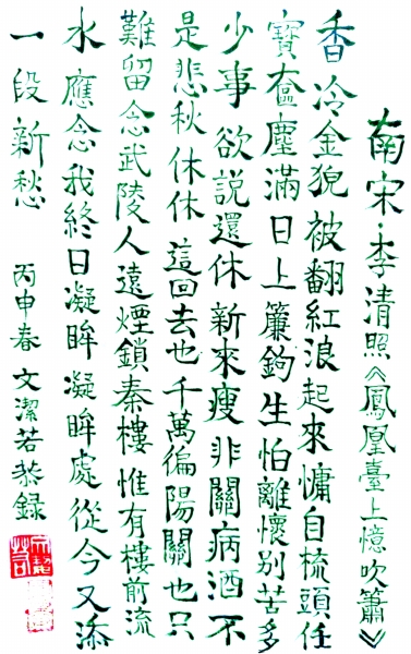 除却翻译和写作,还常有人请文洁若写书法。她一直说自己不是专业的书法家,但她年幼时,在民国的小学里正经学过书法,算是有“童子功”,此后80多年又一直在用钢笔、油笔和毛笔写字,时间久了,自然形成了充满书卷气的文人风格,大家称赞她的字是“文洁体”,再加上她又是著名翻译家和文化学者,她的书法手稿受人追捧也不足为奇。这原本是件让她引以为豪的事,却给她带来了苦恼,经常有来自各地的信件向她索要书法,有的人还多次来信索要,而且连回信邮资都不付。文洁若这代人很重诚信和礼节,尽管时间宝贵,可她还是坚持放下手中的工作,为索字者写书法,还要花费时间去邮局邮寄。这样的情况太多了,90岁的老人哪能吃得消?开始她还每信必复,后来在朋友的再三劝说下,才对这种无偿索字者不予理睬了。