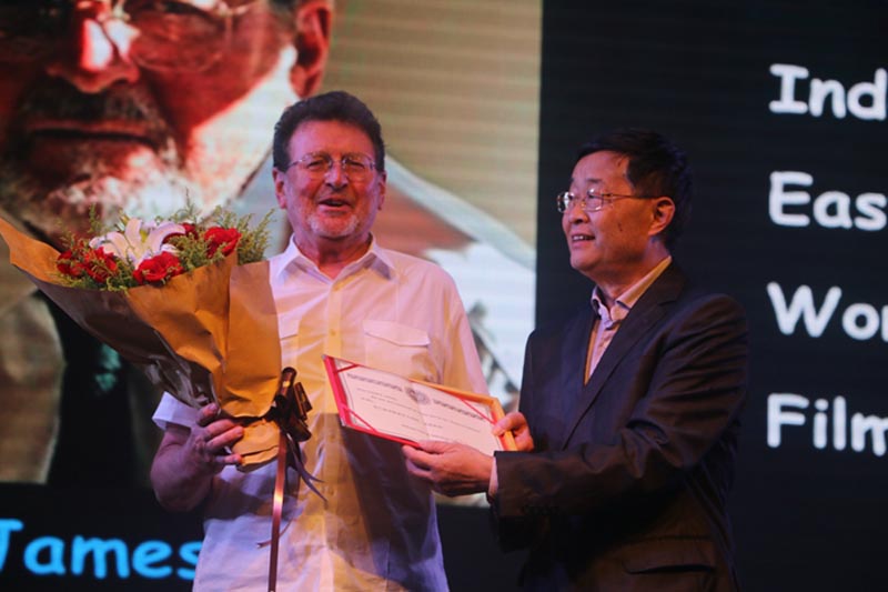 罗共和(右)授予南加州大学电影学院大卫詹姆斯教授川影客座教授聘书