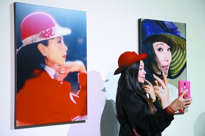 展览开幕当日,参观者在贾育平的作品前模仿自拍。