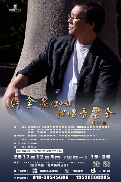 12月4日晚,男中音歌唱家、中国音乐学院声歌系教授马金泉独唱音乐会将在国家图书馆艺术中心音乐厅唱响。