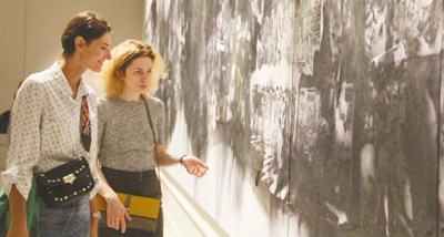 图为俄罗斯观众在欣赏蔡国强作品《河流》。张晓东摄