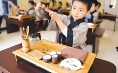 近年来“国学热”持续升温,图为长春市一家“童学馆”里,身着汉服的孩子学习茶道。张瑶 摄(中新社发)