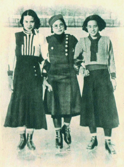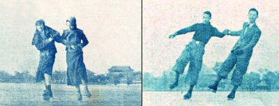 1935年1月21日申报图画特刊刊登参加华北运动会冰上表演大会预选赛的北平选手萧淑芳、胡祖澂、韩度。
