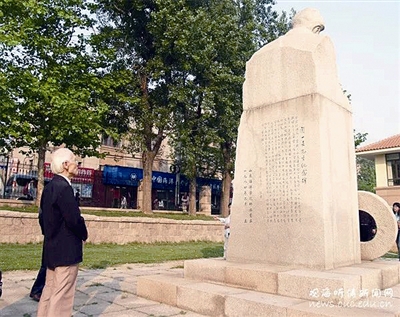 2006年,余光中先生于海大闻一多像前细读碑文。