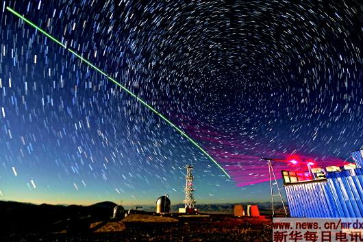 ▲“墨子号”量子科学实验卫星与阿里量子隐形传态实验平台建立天地链路(合成照片,2016年12月9日摄)。新华社记者金立旺摄