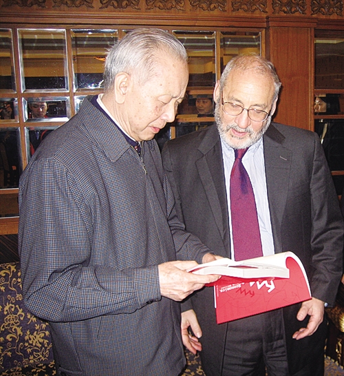 谭崇台(左)与前世界银行副行长、诺贝尔经济学奖获得者施蒂格列茨交流。 (资料图片)