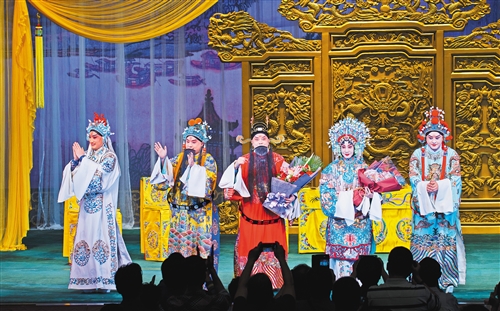 今年5月份,北京长安大戏院,杜鹏(中)、王蓉蓉(右二)演出结束谢幕时,受到现场观众的热情回应和喝彩。两位京剧表演艺术家感受到,如今京剧的群众基础越来越深厚。 本报记者 乔金亮摄