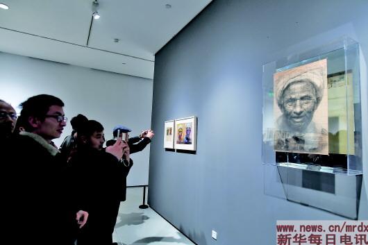 ◤观众在四川美术学院虎溪校区罗中立美术馆“正在发生——罗中立手稿展”上观看《父亲》手稿作品(2017年12月29日摄)。