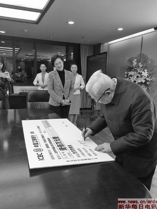 ▲新闻史学家、中国人民大学荣誉一级教授方汉奇在“方汉奇基金会”成立仪式上签名。 新华社发