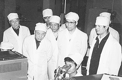 20世纪80年代,童志鹏(左二)参观新研制出的电子设备。