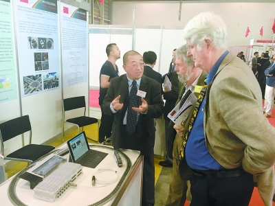 贾利民教授为日内瓦国际发明展评委讲解发明专利“轨道交通列车运行安全状态在线辨识与评估预警方法及装置”。