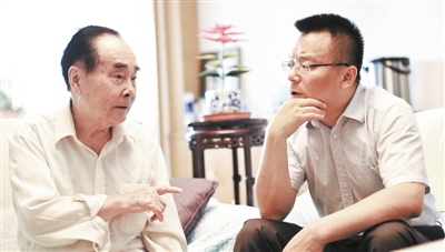 2013年,侯云德(左一)与同事谈论科技成果转化问题。