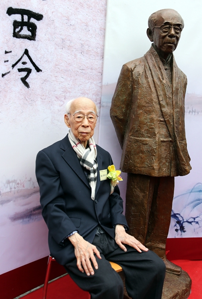 国学大师饶宗颐出席其铜像揭幕暨“艺聚西泠”展览开幕典礼(2012年12月14日摄)。新华社记者 李鹏/摄