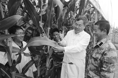 吉林农业大学刘慧涛(中)正在为农民讲解玉米长势 陈一昊摄