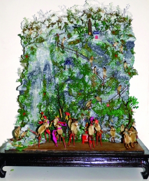 荣慧生是个天生爱琢磨的性子,做什么都想做得再好一些,“过去的毛猴不分男女,当时师傅和我就想到一个主意,找了一种小知了,把眼睛当成胸。但我觉得不好看,总觉得跟没穿衣服似的。后来我找到一种脱了皮的辛夷花,用胶粘在身上,这才觉得合适了。”有脖子是荣慧生作品的另一大特色,“别人做的都是缩脖子,就我做的有脖子。我做过十二年象牙雕刻,做这些很有经验。”