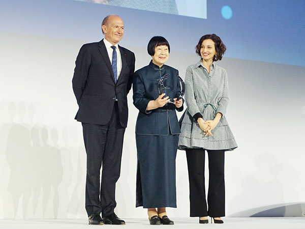 图片说明:张弥曼(中)在“世界杰出女科学家奖”颁奖典礼