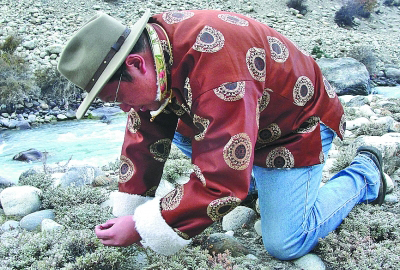 在青藏高原爬山,很多年轻人赶不上他,甚至很多当地人都赶不上他。背着东西在山上到处走,更是不轻松,他的双肩包比谁的都重。因为长期在高原野外工作,他的头发晒成了微微弯曲的卷发。