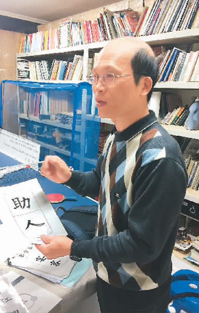 陈忠建在给记者介绍习字之道。吴亚明摄