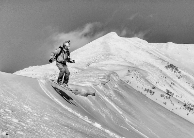 图为手持相机的杜海军越过雪坡。供图/杜海军
