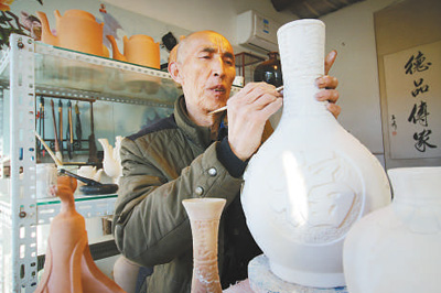在河北固安县东马村的一处古色古香的农家小院里,65岁的王秀(上图)正在享受其陶艺人生:只见他眉头紧收,眼神专注,把一块沾水的泥巴置于转盘之上,用拇指先在泥块中间定出一个中心,随后双手顺着泥巴的边缘,紧握与收拢,原本不成形的泥巴很听话地“扶摇直上”,伴随着手型的变换,泥柱开始长出光洁的“肚子”……此时他双臂运力,双手上提,泥坯子被拉出一个细长的“脖子”,花瓶之形乍现。瓶颈曲线灵动柔美,犹如仙鹤之颈。