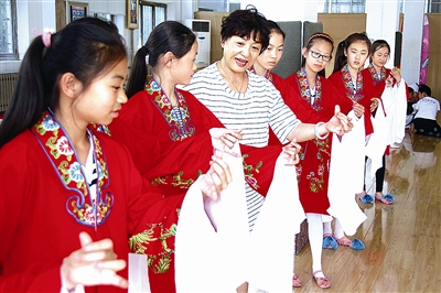 每周袁玲都会拿出2天的时间将非遗文化带进校园,手把手教孩子们表演柳腔。