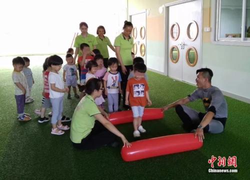 杨洋(右一)带着小朋友完成趣味运动训练。 受访者供图
