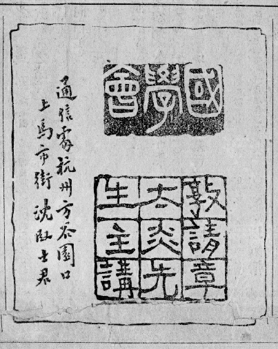 在该日的同一广告版面上,与《越社丛刻》书讯广告相邻的另一则广告是李叔同为“国学会”请章太炎作演讲而设计的图案。