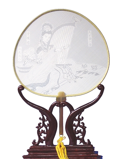 “秀”——竹不仅有色之美,还有声、韵之秀。曾有诗描绘“风惊晓叶如闻雨,月过春枝似带烟”。竹丝编制的龚扇无法再现竹叶摩挲如潇潇雨音,但轻叩龚扇扇柄,可闻“砰砰”擂鼓之声。这得益于龚氏的绷扇秘技,只有当绷直扇面的张力达到一定程度,才能产生这样悦耳的声音。经龚道勇之手绷抻的龚扇能不受气候炎凉交替影响而变形。龚道勇的高超技艺仿佛还能将画中之声化虚为实。在他的作品《箜篌图》中,以纵横交错的篾丝来表现绷紧的直线,扇面中仕女弹奏的“箜篌”琴弦挺直且有弹性,仿佛轻轻一拨,就能发出悠扬的乐声。龚道勇的作品还具备变幻多姿的神韵。他利用竹丝本身细微的色差组成富有层次的画面,在不同角度和光线下,龚扇呈现出朦胧变化之感。从这一侧看,仕女仙子衣袂翻飞,飘带忽隐忽现。从另一侧看,四周花草明暗交替,烟云若有似无。