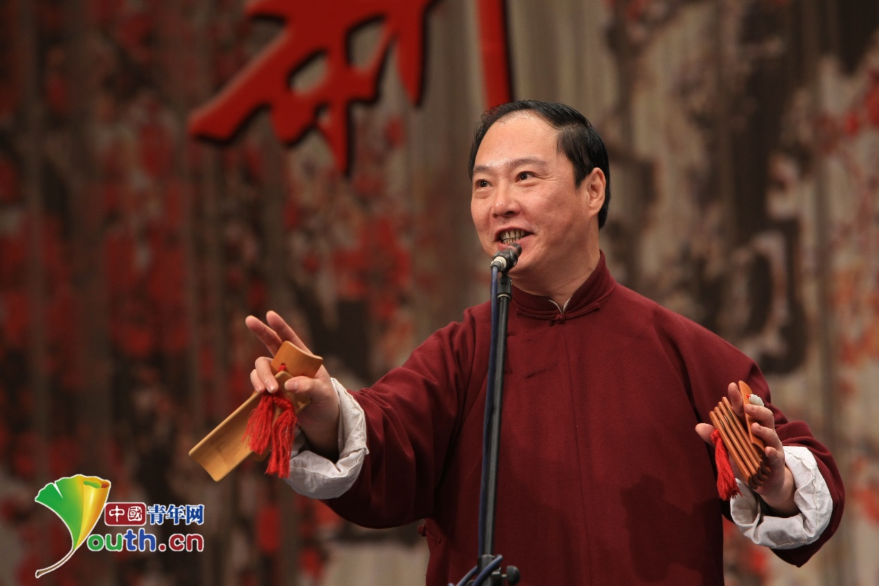 非物质文化遗产快板书传承人李少杰在舞台表演。本人供图