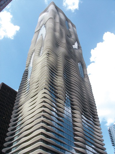 2009年年底,美国芝加哥市中心北哥伦布大道225号,一幢外观呈波浪形、具有迷人的视觉冲击力的摩天大楼拔地而起,引起世界瞩目,它就是著名的爱克瓦大厦,或更形象地称之为“水楼”。这幢82层的高楼,是迄今为止由女性建筑师设计并建成的最高建筑物,证明了摩天大楼不再是男性建筑师的专利。