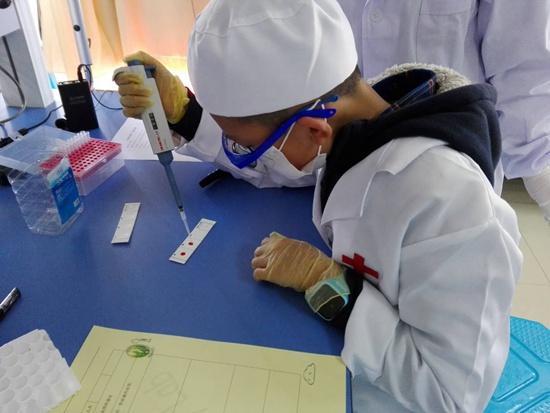 参加《血液的秘密》的小学员在做血型鉴定实验。谢楠/摄