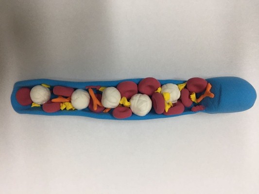 昆明市西山区春苑小学7岁的李梦婷制作的静脉血管中的红细胞、白细胞、血小板和血型抗体。曹霞/摄