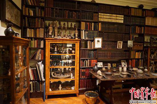 位于门厅另一侧的书房可以说是博物馆的“心脏”。这里几乎囊括了弗洛伊德从维也纳带到伦敦的所有“宝贝”。有他收藏的图书、照片、2000多件古董,他进行精神分析时患者用的沙发、书桌、漂亮的东方地毯等。