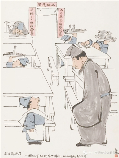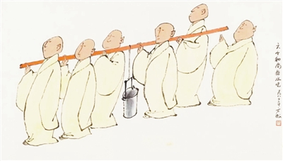 方老常说化丑为美。一幅好的漫画首先是一件艺术品,必须讲究形式美。老鼠是很丑的,美国漫画家创造出来的米老鼠形象就很美,齐白石的老鼠能挂在墙上欣赏……故此,方老的作品构思奇巧,造型严谨,针砭时弊,令人回味。例如《武大郎开店》《脑瘤手术》《一人得道》《六个和尚抬水吃》等作品在坊间广为流传,甚至被改编成地方戏。