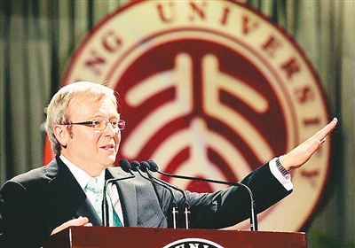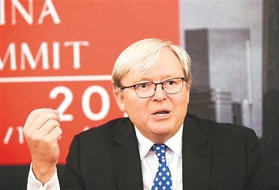 2018年4月14日,在美国费城宾夕法尼亚大学,陆克文出席宾大沃顿中美峰会。陆克文说,中国改革开放40年成绩骄人,其中最了不起的是使7亿中国人成功脱贫。新华社记者 王迎 摄