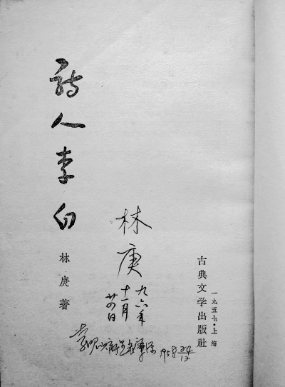 1996年11月24日,我又在燕南园与林先生见过一次。为什么日子记得如此肯定、清晰?因为,那时我在摊上买到一本林先生早年的著作《诗人李白》。为1956年8月古典文学出版社初版,1957年9月第四次印刷的版本,印数51000。关于此书,后来林先生在信中曾告诉我,此书书稿和《中国文学简史》为文怀沙先生为“新文艺”(上海文艺联合出版社)所约,书名的书法也是文先生所写的。