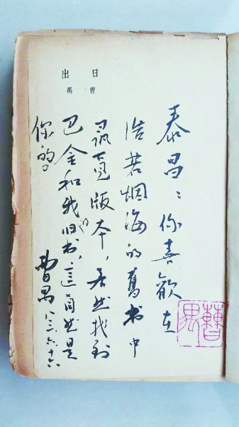 回到北京,有天我去看望病中的曹禺先生。他问起上海之行的种种情况,当我提起买到一些好书时,他笑着说:你又发财了!我从提包里拿出他的《日出》初版本,他接过去眼睛直直盯着全黑的书皮,急促地翻着,又忙问我从哪里买到的?我说,送给您。他连声说谢谢。他将书拿到书房里去了,叫我先坐坐。已有段时日没来看望他了,见他今天开心,我也高兴,特别是他刚刚出院回来。不一会,他抱了几本书回到客厅,说感谢我的一片好意,送我三本重印的书,手里仍拿着我送给他的1936年巴金主编的文学丛刊编印的《日出》初版本。他站在我面前说:这本书对我当然宝贵,但你是爱书人,还是你保存好。我还为你写了几句话……我小心地翻开发黄的、已见破碎的扉页,上面写着几行秀丽的毛笔字(见上图)——