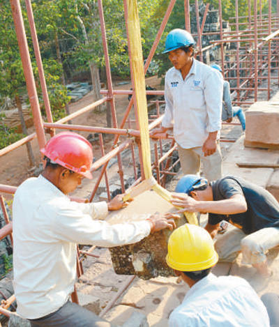文物修复是专业性极强的一项工作。在修复茶胶寺时,中国文物修复团队发现须弥台顶端的庙山五塔面临险情,为确保文物与游客安全,必须对其进行排险加固。“我们在抱厦入口处进行了钢结构支护,这些支护措施都是严格根据残损情况量体裁衣制作的,属于‘可逆措施’。”中国工作队成员袁濛茜说,当时有国际专家提出质疑,建议使用锚杆加固石构件,将有险情的石块穿在一起。“暹粒常年高温多雨,紫外线强烈,锚杆材料老化后可能会破坏文物本体,造成不可逆的损失。”中国专家最终还是坚持了使用钢结构支护的做法,并得到了认可。